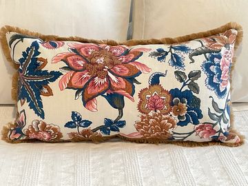 Made with vintage fabric sourced from antique store in Texas. Linen blend with cream background, mauve pink, indigo, tan flowers. Fringe trim. Only two made.